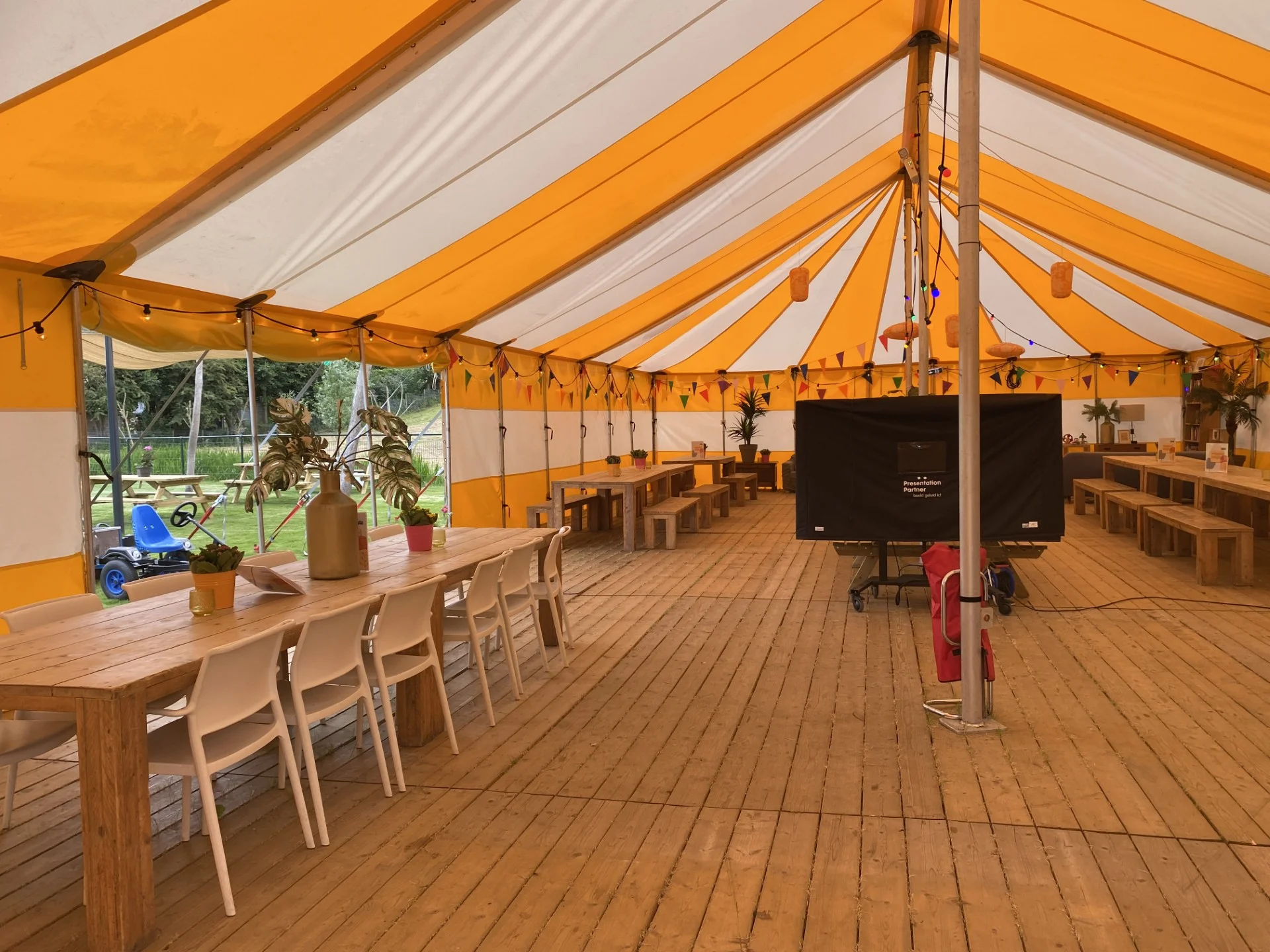 Centraal op de camping staat een grote tent waar we samenkomen voor gezellige activiteiten en gezamenlijke maaltijden. Hier ontstaat verbinding, lachen we samen en delen we mooie momenten.